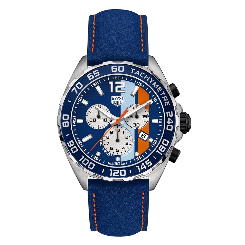 An iconic sky-blue and orange chronograph that pays homage to Gulf, one of motor racings most legendary sponsors. The generous 43mm-diameter steel case is fronted with a striped dial with three sub-dials laid out like a car dashboard and protected by a sapphire crystal windshield. The blue aluminum tachymeter fixed bezel has racing-inspired notches for easy handling. The blue strap with orange top-stitching is in soft calf skin.