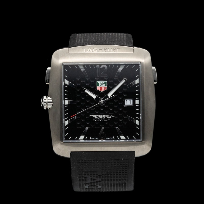 The TAG Heuer WAE1111 is a striking example of modern design fused with TAG Heuers signature sportiness. This watch stands out with its bold square case, a nod to the iconic motorsport heritage that defines the Monaco line. The textured black dial is accented by luminous hands and bold hour markers for optimal legibility, along with a date display at 3 oclock for added practicality. Powered by a reliable quartz movement, the WAE1111 offers precision and low-maintenance performance, making it an ideal sporting companion. Its robust build, sapphire crystal, and black rubber strap complete a well rounded watch.