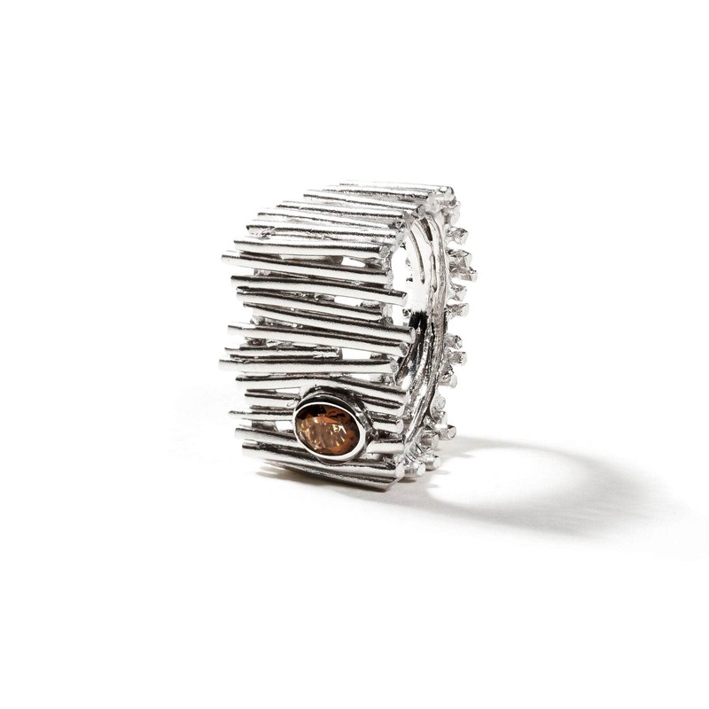 A mysterious smoky quartz drop caught in the wattle fence of 's new gender-blind ring - also available with Black Rhodium plating.Metal: 925 SilverStones: Smoky QuartzPlating: White Rhodium, 18K GoldWidth 22 mmBand wide 6 mmLength 24 mmWeight 12.90 g