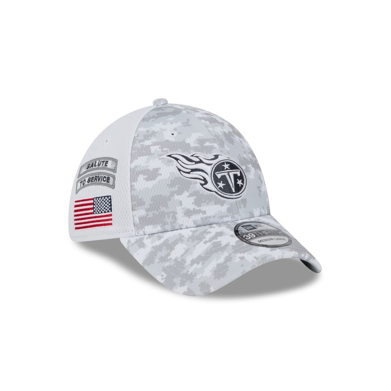 The Tennessee Titans 2024 Salute to Service 39THIRTY Stretch Fit Cap features an embroidered Titans logo at the front panels with the official NFL Salute to Service patch at the rear. Additional details include a Salute to Service banner and American flag patch at the right-wear side with an snow camo fabrication and gray undervisor.