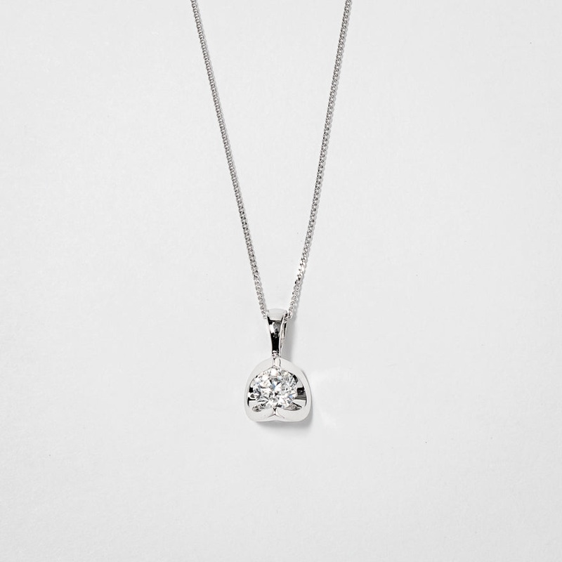 This luxurious Canadian diamond necklace is crafted in 14K white gold. The single 0.40 carat round brilliant Canadian diamond is tension-set in a faceted eye-catching setting and polished to enhance the sparkle of your Ann-Louise Canadian diamond. Ready to
