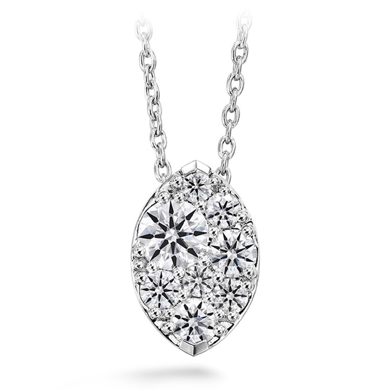 Navette is another term to describe a jewelry contour. Pointed at both ends with equally curved sides. Seamless, irregular pave to create a classic, but unique cluster look. Tapered from top to bottom to enhance the appearance of pure sparkle from the top view and help the pendant lay flush against the skin. Beautifully honey-combed back plating, mirrored inside and out for more luxurious finishing details.