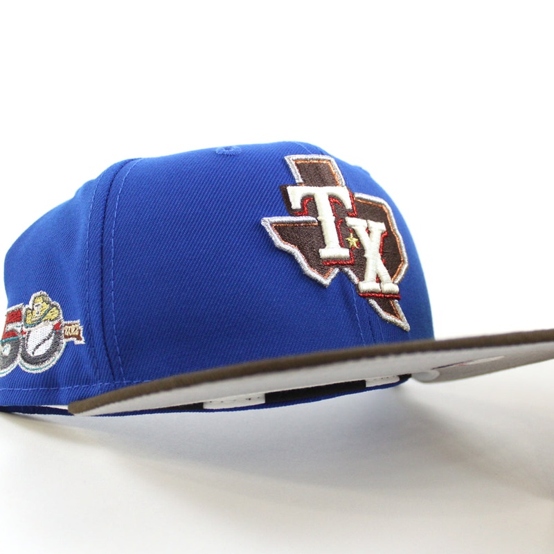 Texas Rangers 50th Anniversary New Era 59Fifty Fitted Cap in Azure, Walnut and Gray under brim. 24