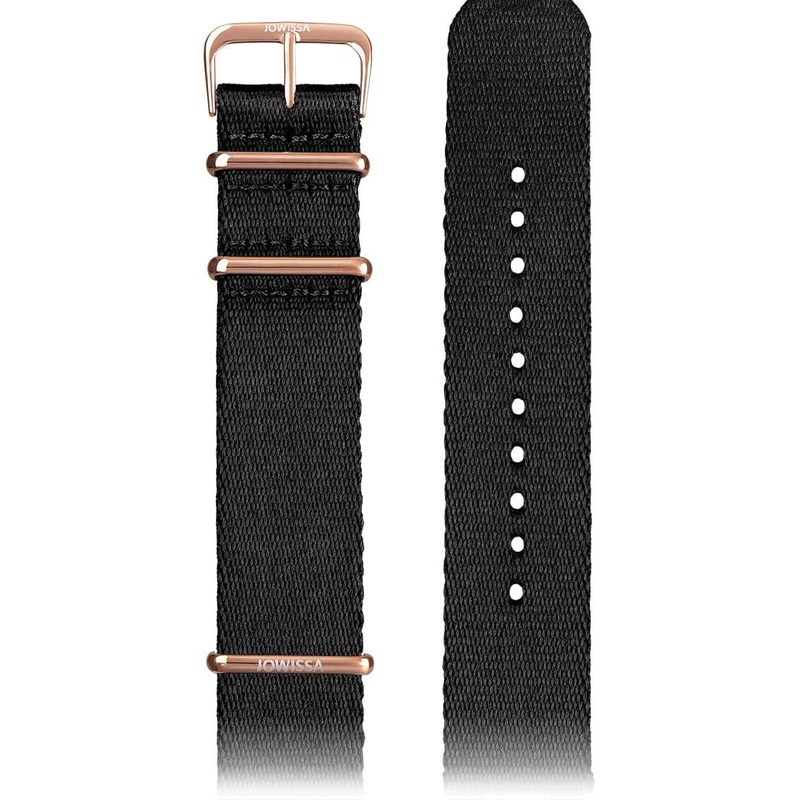 Strap materialNATO strap made of textileBand width22 mmBuckleStainless steel with laser-engraved logoBuckle colourRose-goldInterchangeable bandYes, with quick release ColorBlack / Rose ReferenceE3.1301
