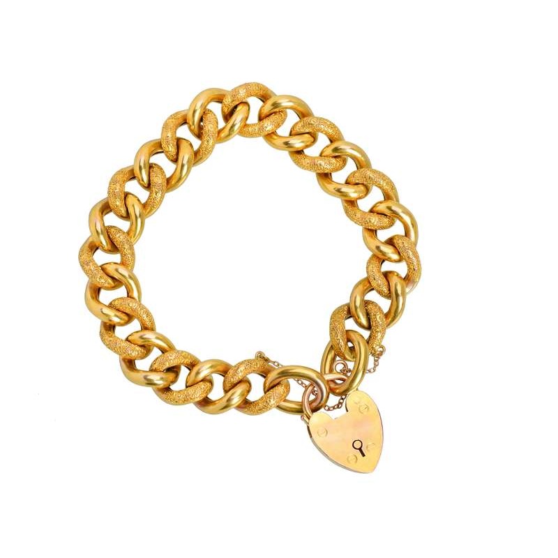The ultimate in a padlock curb link bracelet comes down to us in near mint condition from circa 1900.Chunky, large and weighty, every other luxurious link is textured for contrast against the high-polished gold all of 9k. It is hard to know what is most ap