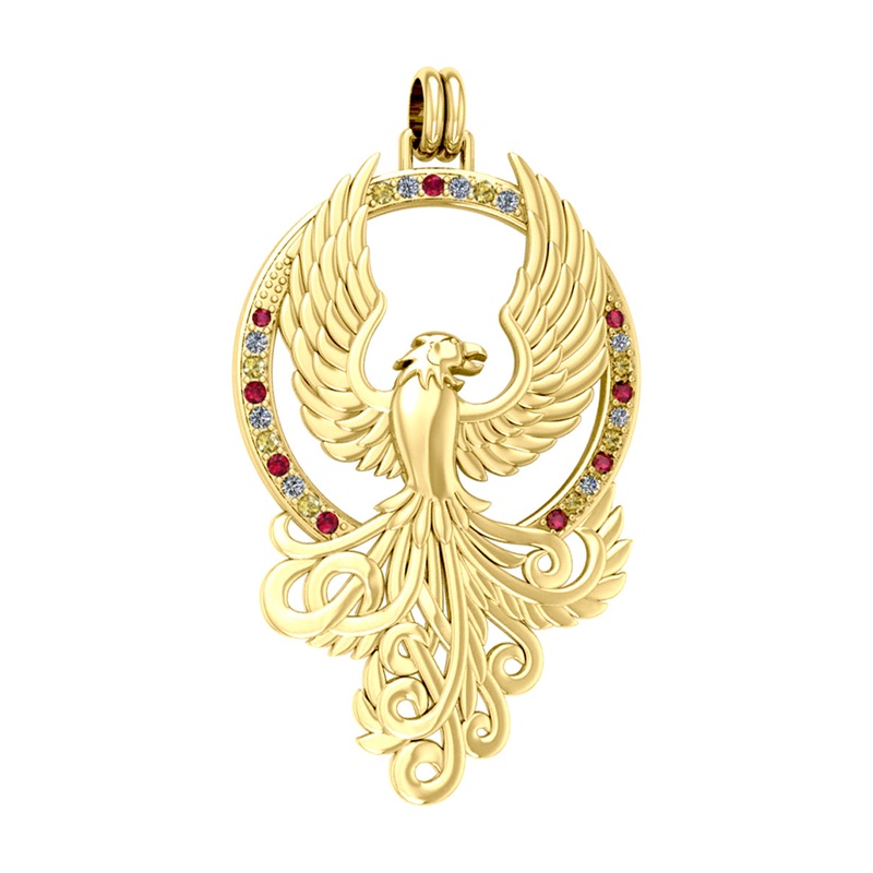 This solid yellow gold pendant features a majestic phoenix design, symbolizing strength and rebirth. Handcrafted with quality and precision, this pendant is a must-have for those seeking a statement piece of jewelry. Adorn yourself with this timeless treasure and embody the power and resilience of the Phoenix.