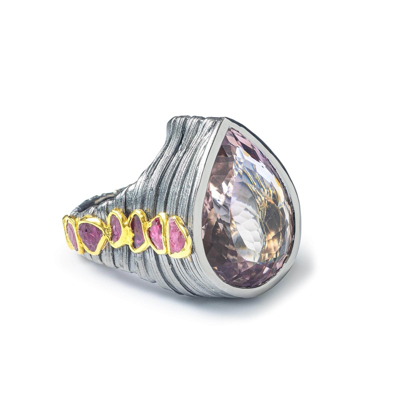 This ring is a bold statement of nature’s raw power. A large, elevated pear-cut Amethyst sits at the center, while rough rubies, captured in golden frames, follow their wild, irregular paths along the side of the textured band. The gems are all natural and untreated, giving this piece an edge that feels more like wearable art than traditional jewelry. Theres only one like it, made for someone who embraces the untamed and the unique.
