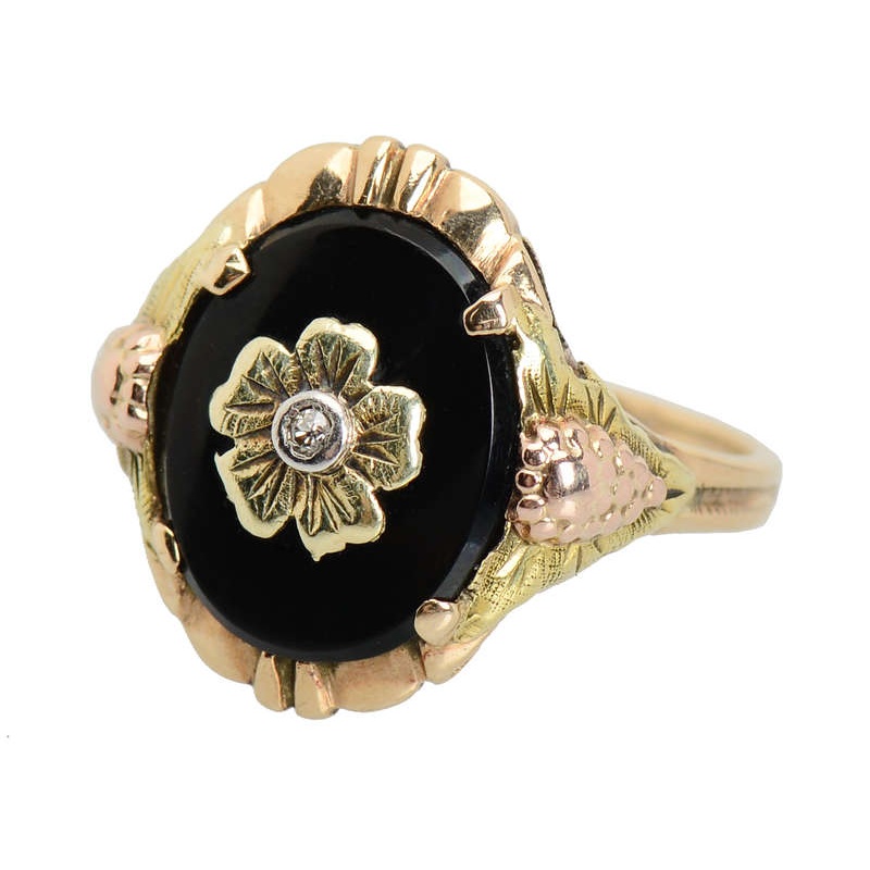 Inky black onyx contrasts three colors of detailed 10k gold.A flower center is dotted with an accent diamond with five scalloped petals surrounding it. An oval plaque of onyx rests amid rose and yellow gold, leaves, and organic motifs. From the Art Deco pe