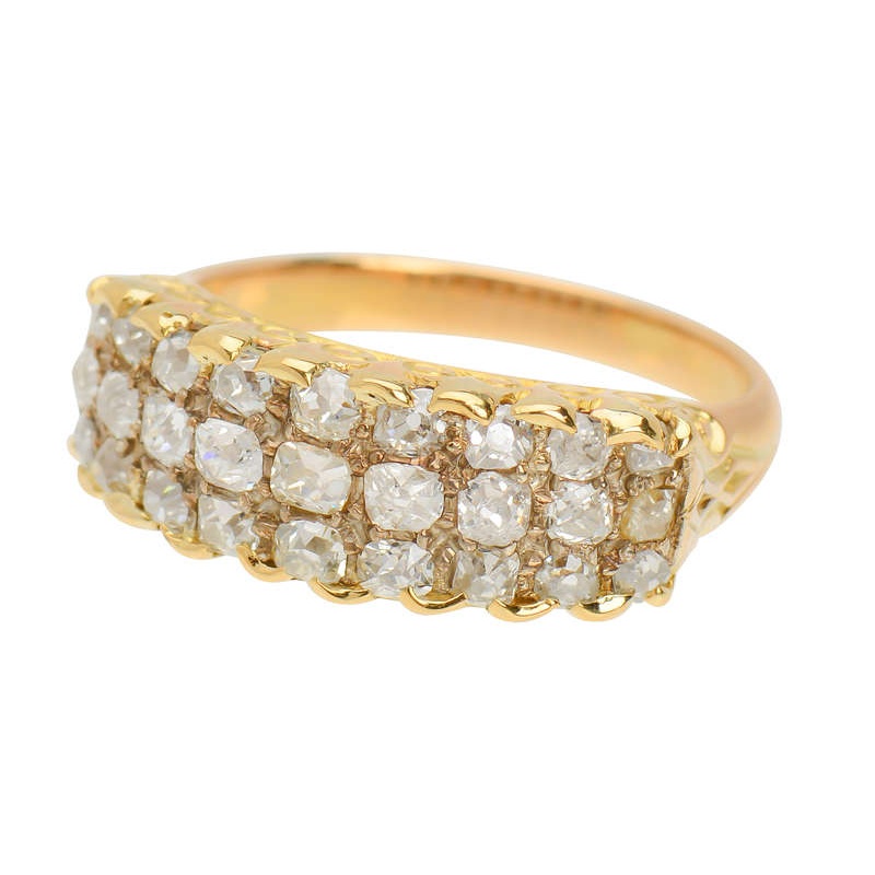 With 1.50 carats of diamonds, spread throughout 27 old mine and old cushion cut diamonds, those three rows of visual dynamite are conflict-free and eco-friendly.