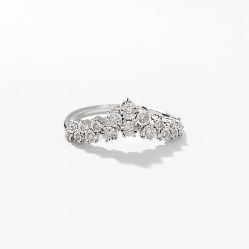 This lovely tiara style diamond cluster ring is sure to add a touch of sparkle to your day. Finely crafted in 10K white gold, it is adorned with 18 round brilliant diamonds for a total diamond weight of 0.20 carats