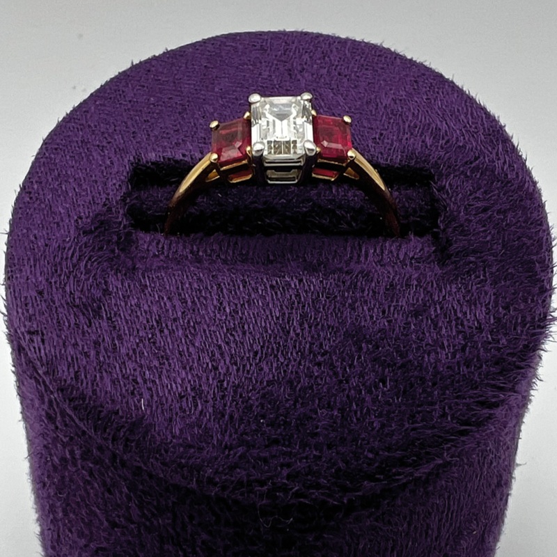 A stunning and incredibly rare Tiffany & Co emerald cut diamond 0.66ct I/VVS2 engagement ring set with two emerald-cut rubies which total .71ct.