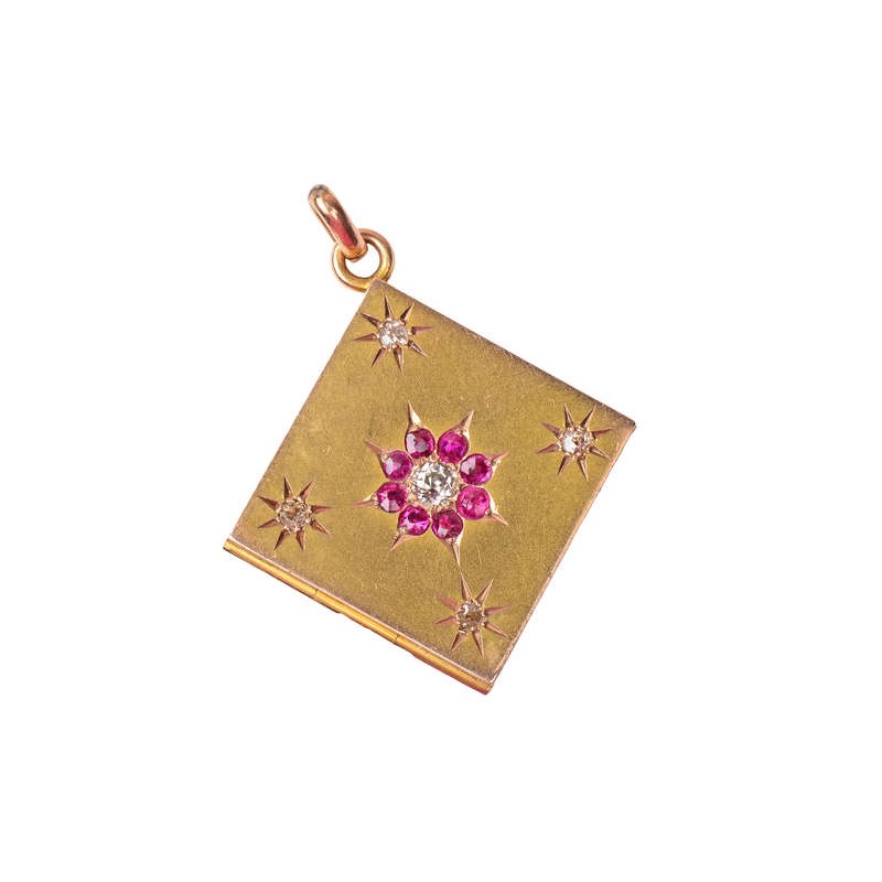 Supremely chic, elegant, and wearable, this is the one you have been waiting for.Water thin for ease of wear, and smashing good looks, this locket pendant is adorned with natural hot pink rubies and fiesty diamonds. Tiny stars and a flower are hand-engrave