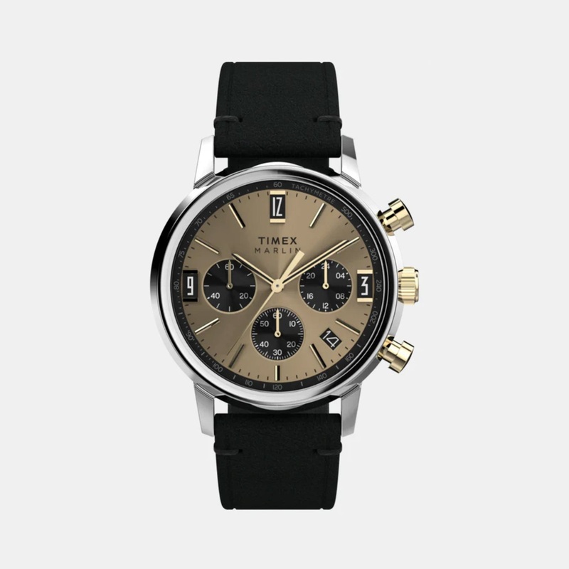 Our Marlin Quartz Chronograph Tachymeter was the first chronograph to join our Marlin line, as well as the first Marlin powered by a quartz movement. Beautifully detailed, it features a tachymeter index along its outer minute track to measure speed, as well as a unique date window placement and gorgeous gold-tone accents on its deep champagne dial. Paired with either an eco-friendly natural leather strap sourced from the Leather Working Group (LWG) with quick-release spring bars. Though its build broke new ground in our watchmaking heritage, this timepiece retains the classic Marlin features with a sturdy 40mm recycled stainless-steel case, domed acrylic crystal, and retro-style applied indices at 3, 9, and 12 o’clock.