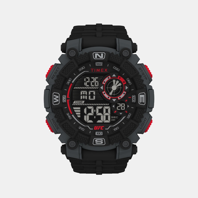 Deceivingly lightweight despite its hardy exterior, the iconic five-button design of the TIMEX UFC Redemption gives you direct access to a 100-hour chronograph, 24-hour countdown timer, military time, dual time zones, alarm, and our revolutionary INDIGLO backlight. Its sealed for water resistance up to 50m and equipped with a compass bezel and black molded resin straps for lasting durability. The textured tactile design of its pushers and substantial gray 50mm case profile are immensely practical features if youre in the middle of trainingsimply reach down, feel for the pusher, and finish the challenge without interruption.