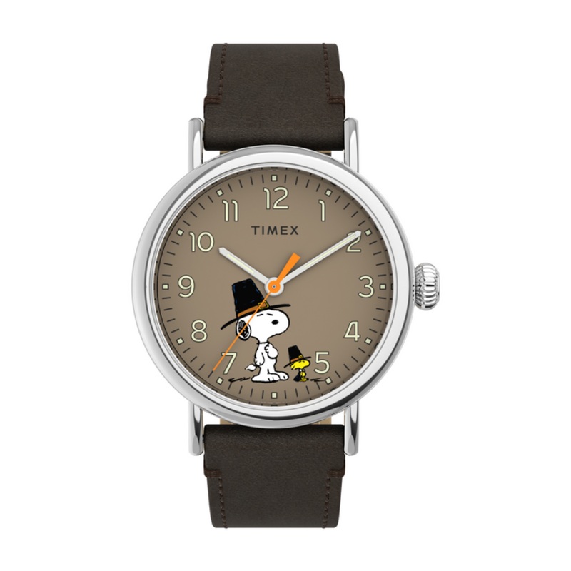 Give thanks for friends! Our most refined everyday watch meets our favorite Peanuts pup. We updated our versatile Timex Standardpairing the silver-tone case and brown leather strap with our pals Snoopy and Woodstock dressed as pilgrims on the dial to celeb