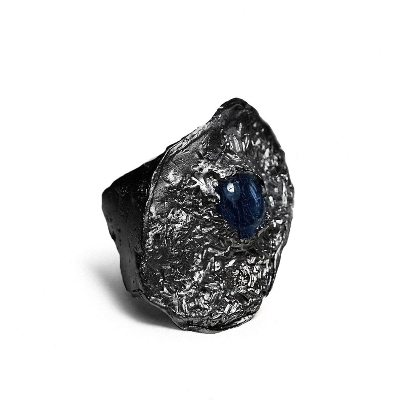 Black rhodium offers metallic sheen reminiscent of volcanic lava flows. At its heart is the crisp beauty of a startlingly blue sapphire. This statement ring mixes textures and has a tactile and fluid beauty. Silver 925 Stone Titania, Blue Sapphire Plating
