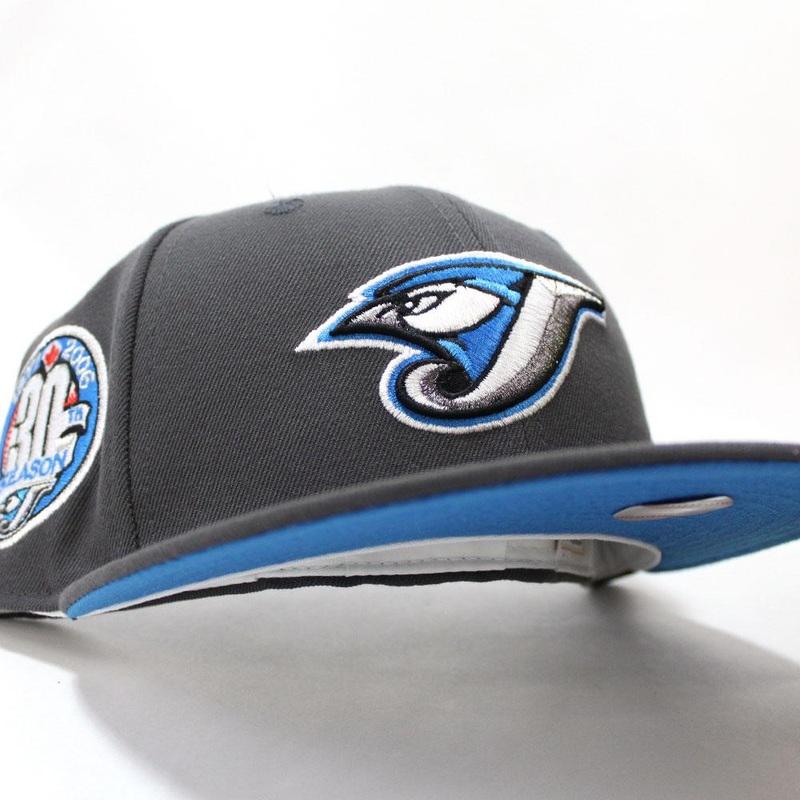 Toronto Blue Jays 30TH Anniversary New Era 59Fifty Fitted Hat in Storm Gray and Blue Under Brim.