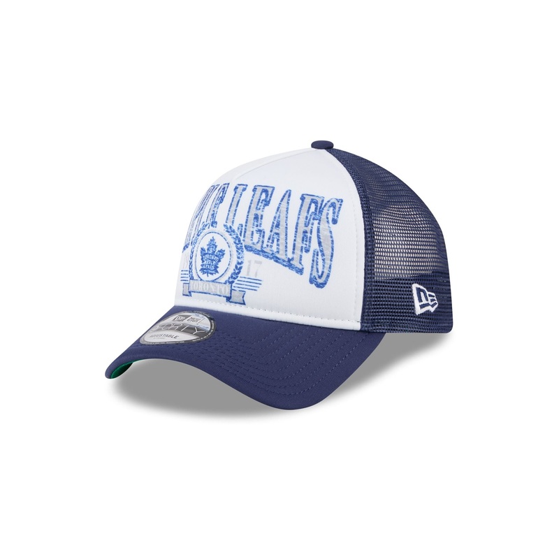 The Toronto Maple Leafs Distressed 9FORTY A-Frame Trucker features a distressed screen-printed Maple Leafs wordmark and logo at the front panels with a team tag at a snapback closure at the rear and a green undervisor.