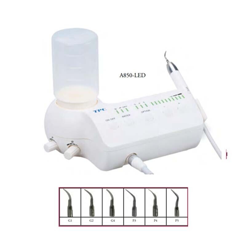 TPC Dental Advance 850LED LED Piezo Scaler w/Bottle SystemDescription:A850-LED-Advance 850-LED Piezo Ultrasonic Scaler & Endodontic UnitFeatures and Benefits Compact unit housing for easy placement anywhere in the operatory Extremely gentle on patient, cau