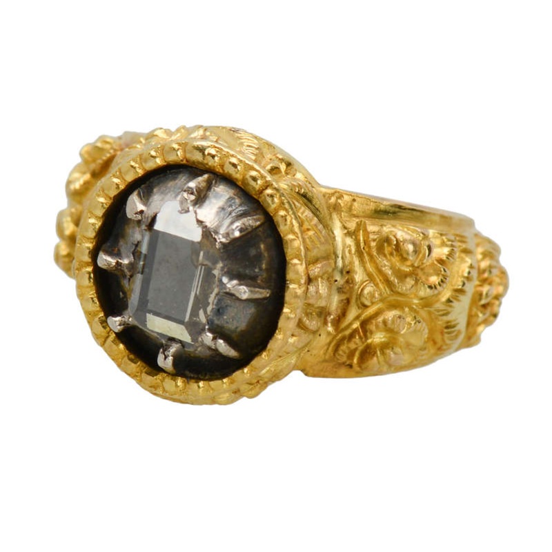 The utilization of a table-cut diamond is rare for this period. Possibly it was refashioned from a family jewel of an earlier time. The ring is 18k yellow gold with deeply worked floral motifs for the shoulders, sides, and base of the center.