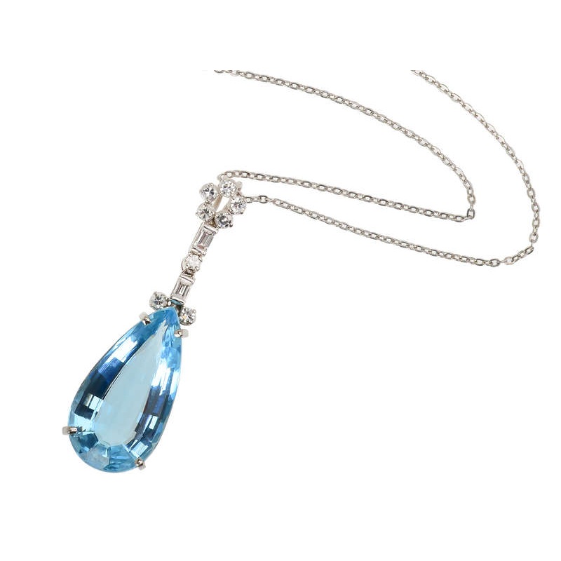Leave yourself, or the recipient, breathless with this aquamarine diamond and platinum pendant necklace.A sublime vintage jewel combines nature's perfection with a dash of human ingenuity and master craft mixed in. A faceted teardrop aquamarine of a magnif