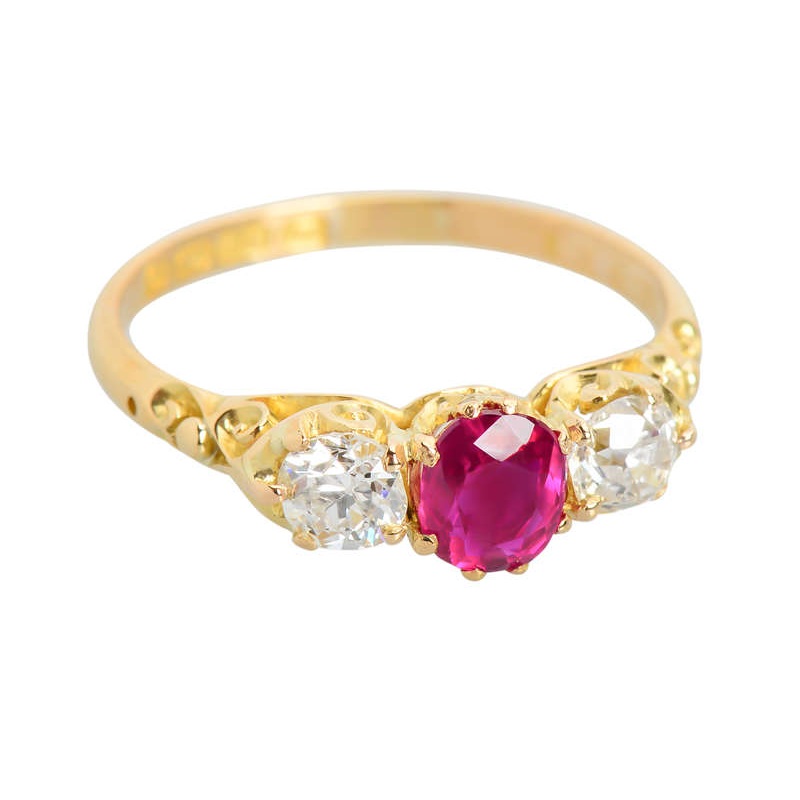 A triple pleasure awaits you in this Edwardian ring designed and fabricated in 1904. A trio of two diamonds and a vivid no-heat natural ruby (.75 carats) shows off its magic to the world. Set in the center, the oval faceted ruby radiates hues from deep red
