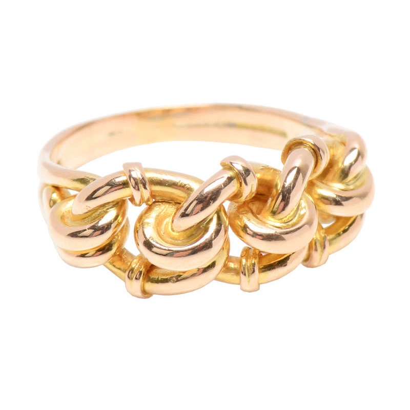 Not only is the style and construction of this ring pure 1900's, but the English hallmark of 18ct fixes the span of years.Three love knots of gold are interlinked to form a sculptural arch across the finger. The touches of six circles on the north and sout