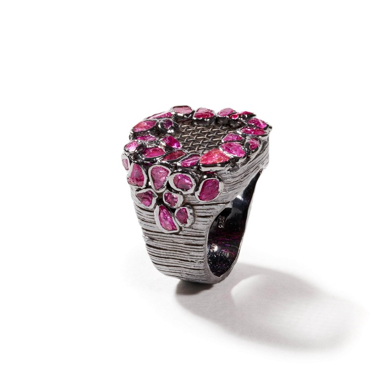 Wild, naturally raw Ruby crystals and Titanium mesh crossbred with 925 Silver make this contemporary ring a real statement of personal standout and a dare to the norms and practices of traditional jewelry. Designed as a one-and-only piece, this ring will s