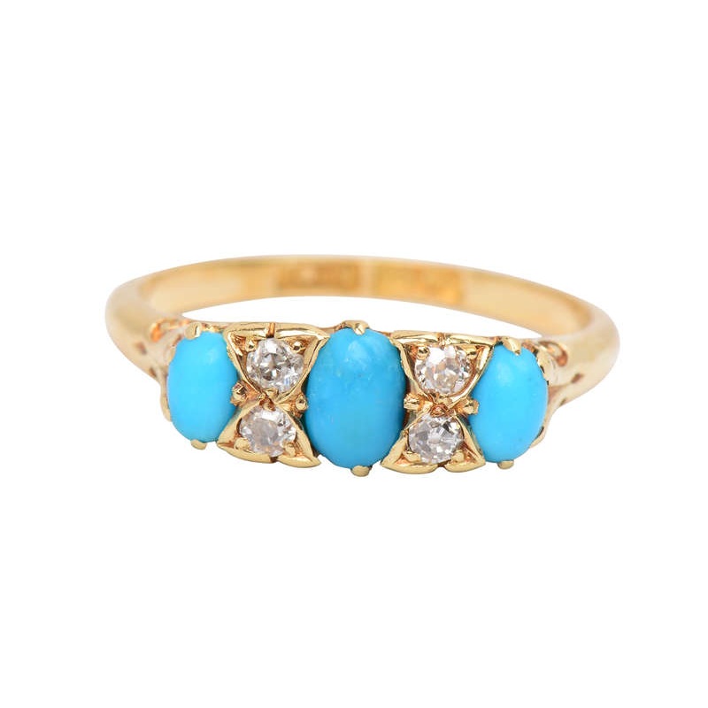 Alternating diamonds and robin’s egg blue turquoise, this vintage three-stone ring is primed for stacking, for wear as a wedding ring, or to don all by itself.