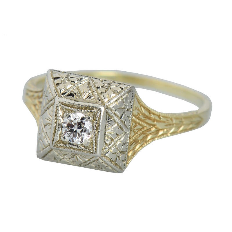 The distinctive, shimmering ring exudes a presence like no other in this Art Deco engagement ring. Geometry and surface detail along with two colors of gold result in a special, one-of-a-kind finger ring.Yellow and white gold of 14k are fashioned into a sq