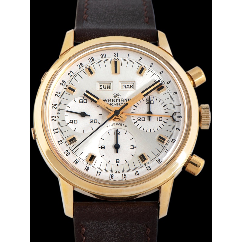 Oversized, elegant, and complicated, this attractive Wakmann Triple Calendar Chronograph features numerous complications in a strategic dial layout to maximize legibility and aesthetics. The robust 39.5mm case wears extremely well and holds up well to mode