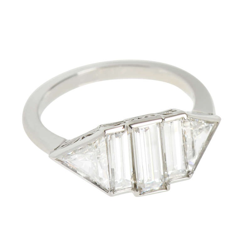 Five diamonds add up to 2.7 carats among three rectangular cuts with two side trilliant cuts. All are bezel set into platinum. Translation – all the diamonds are well protected!