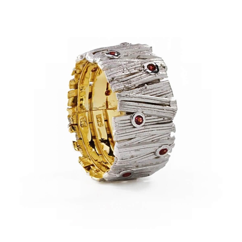 Rhodolite is a sparkling gemstone of true vivacious spirit. It has been encased in bright white rhodium in slices of precious metal that battle with its deep color. Glints of gold frame these raw jewels and echo the brilliant interior of the piece.Silver 9