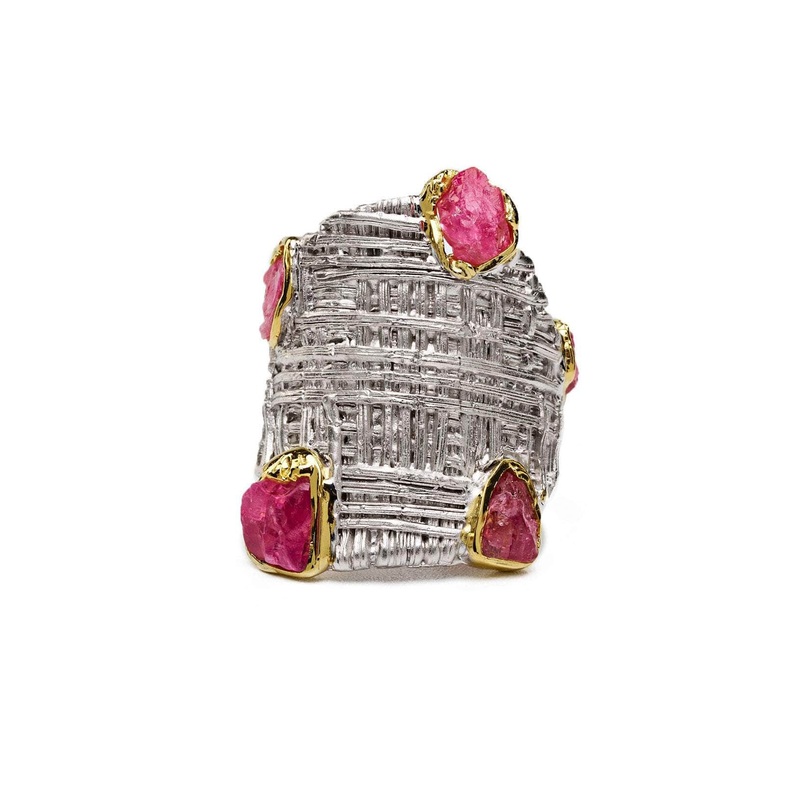 A ring crafted of white rhodium that seems to emerge from the depths of the earth. Soulful and glorious it is crowned with stunning pink rough spinel gemstones. Their bright warmth glitters against the textured surface of the precious metal.PLEASE NOTE tha