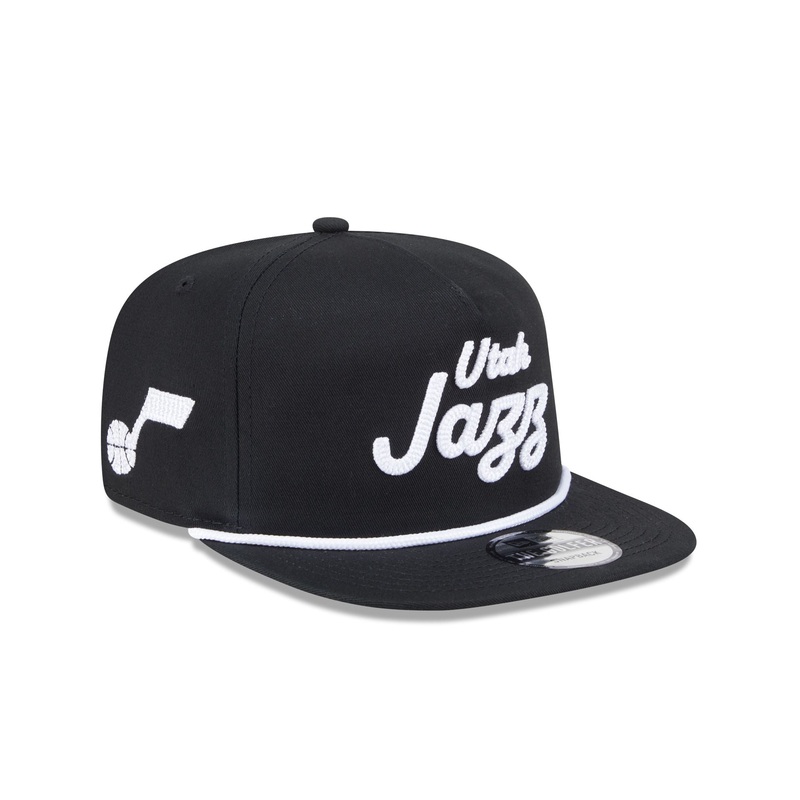The Utah Jazz Team Text Golfer features an embroidered Jazz script at the front panels with a team logo at the right-wear side and a snapback closure at the rear.