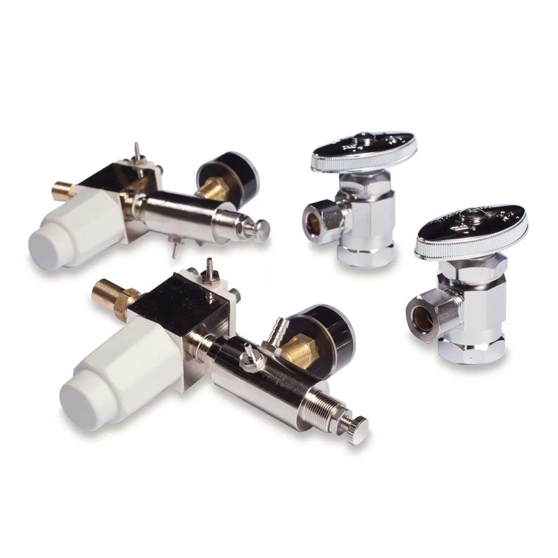 Includes Plated Solid Brass Bowl Air and water gauges Space-saver filter/reg Air and water auto shut-offs Requires master toggle valve Angle stops Includes a selection of barbs, washers, and plugs Includes Replacement Brass Ferrule and Nut For Angle Stop