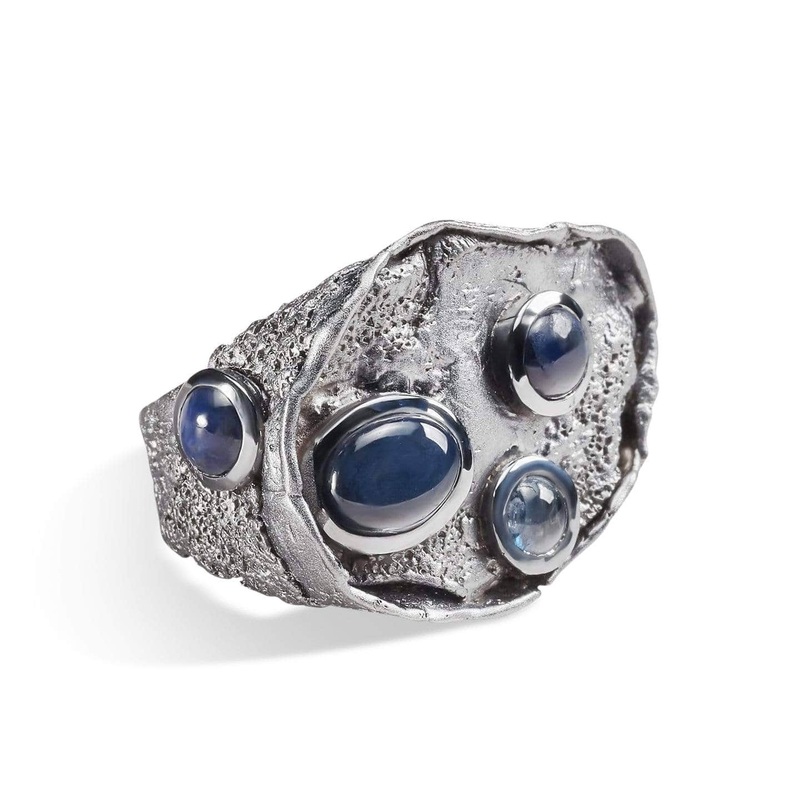 Reminiscent of natural organic creation this ring is crafted of black rhodium. Its depth of color and unique texture is a sensory place for a series of rich blue sapphires to rest. They create a vibrant light that adds further texture and sensory enjoyment.