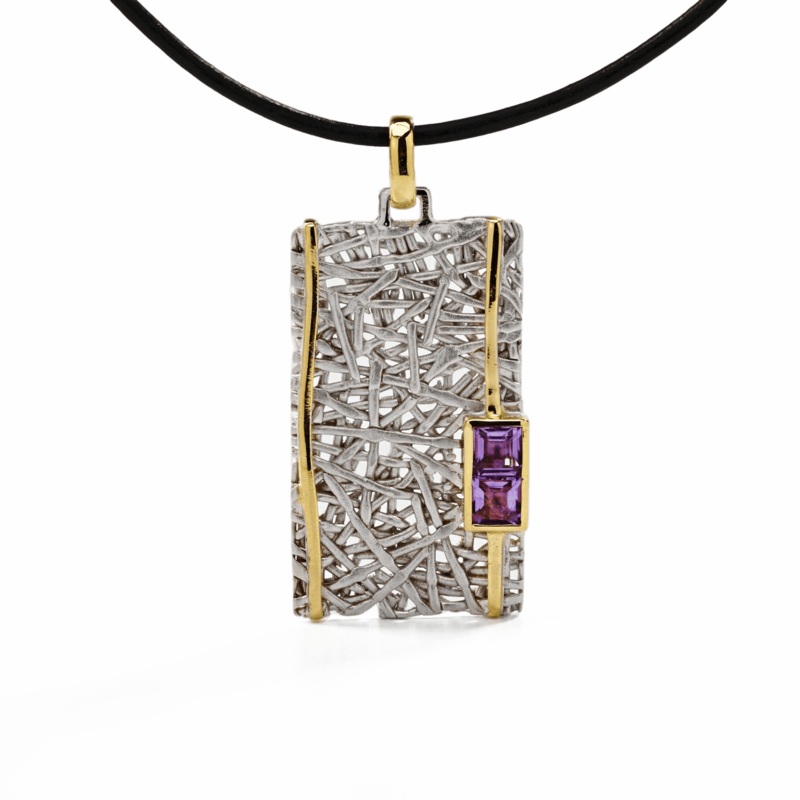 Framed in delicate yellow gold and gorgeous white rhodium this pendant has been created for the Verina jewel set collection. Its destiny is to be worn together with the Verina Ringand Earrings. Its latticed effect of precious woven metal is punctuated with a gemstone that seems to shine with its own otherworldly light. Available in blue topaz, white topaz, peridot and amethyst. A true cascade of color choice that is yours to make.