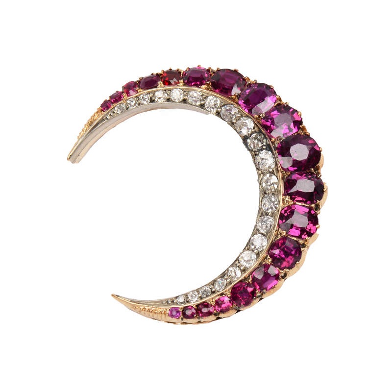 If anyone could bring the heavens down to earth, it was the jewelers of the Victorian era. The crescent moon motif was much in vogue during the later decades of the 19th century, along with its cousins, stars, and comets. To experience it in glowing, fine