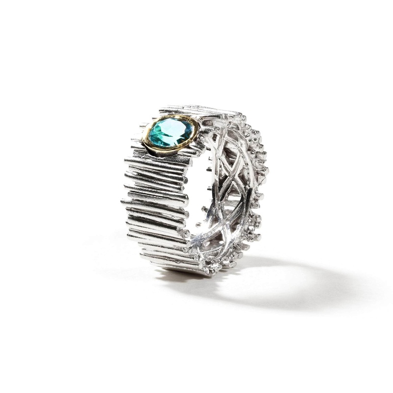 A gender-blind minimalistic textural silver ring with natural ice-clear blue topaz oval.Also available with Black Rhodium and Gold plating.Metal: 925 SilverStones: Sky Blue TopazPlating: White Rhodium, 18K GoldWidth 13 mmBand wide 9 mmLength 20 mmWeight 17