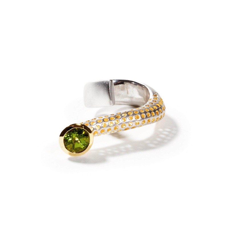 Natural round-cut Green Peridot is spotlighted on this bold and daring statement ring of 925 Silver plated with 18K Gold and precious White Rhodium. This unusual design is a perfect fit for those who feel different and want to embrace this feeling. The ring is a one-of-a-kind collector’s item with no second copy available.