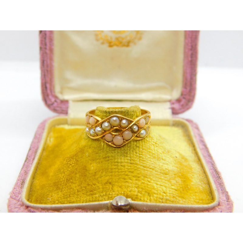 Details: A fantastic and wonderfully designed antique Victorian 18ct yellow gold crossover ring set with seed pearl & coral c1860, the gold has been XRF tested. This is a wonderful item that would make a perfect gift or addition to any collection. The BOX