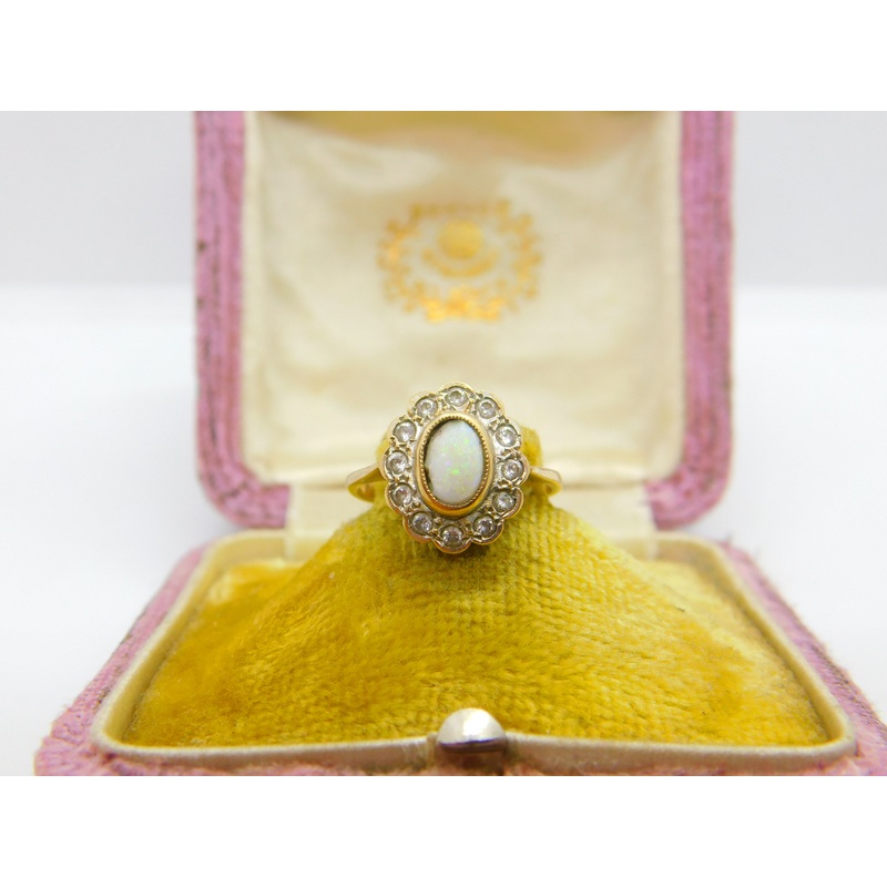 Details: A fantastic and wonderfully designed antique Victorian 9ct yellow gold floral cluster ring set with central cabochon cut opal and white spinels c1880, the gold has been XRF tested. This is a wonderful item that would make a perfect gift or additio