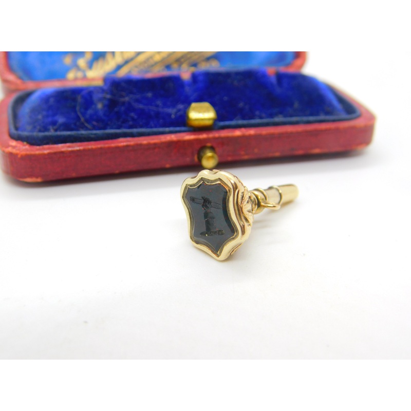 Details: A fantastic and wonderfully designed antique Victorian 9ct yellow gold watch key fob seal set with superb carved bloodstone intaglio depicting a hand holding a staff c1860. The gold has been XRF tested. This is a wonderful item that would make a p