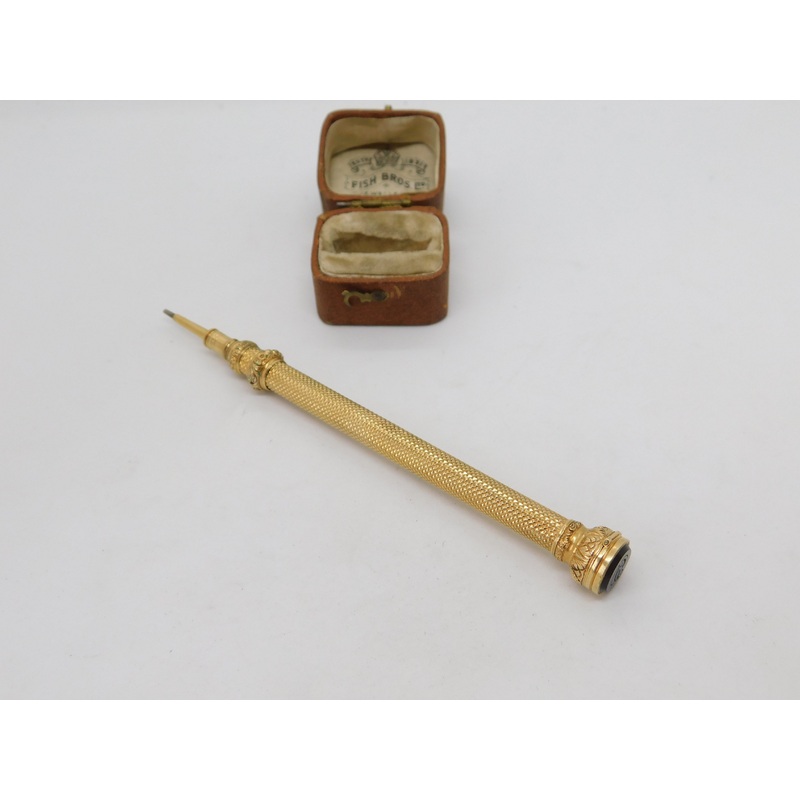 Details: A fantastic and wonderfully designed antique Victorian 9ct gold cased propelling pencil with agate R initial intaglio to the terminal c1880. This is a wonderful item that would make a perfect gift or addition to any collection. The BOX pictured is