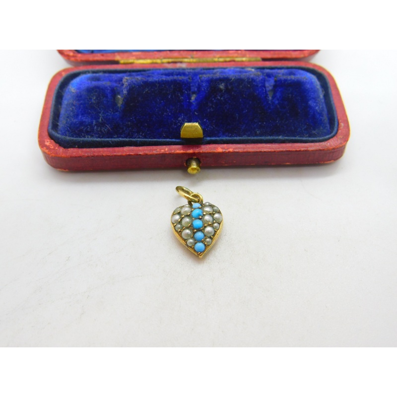Details: A fantastic and wonderfully designed antique Victorian 9ct yellow gold cased seed pearl and turquoise heart drop pendant c1890. This is a wonderful item that would make a perfect gift or addition to any collection. The BOX pictured is for PRESENTA