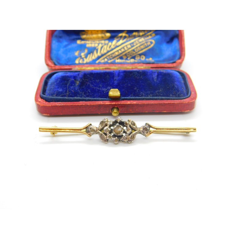 Details: A fantastic and wonderfully designed antique Victorian 9ct yellow gold conversion bar brooch set with gorgeous 18ct gold central set panel with approx 0.5ct of rose cut diamonds, the central stone measuring approx. 0.2ct c1860. The diamonds have a