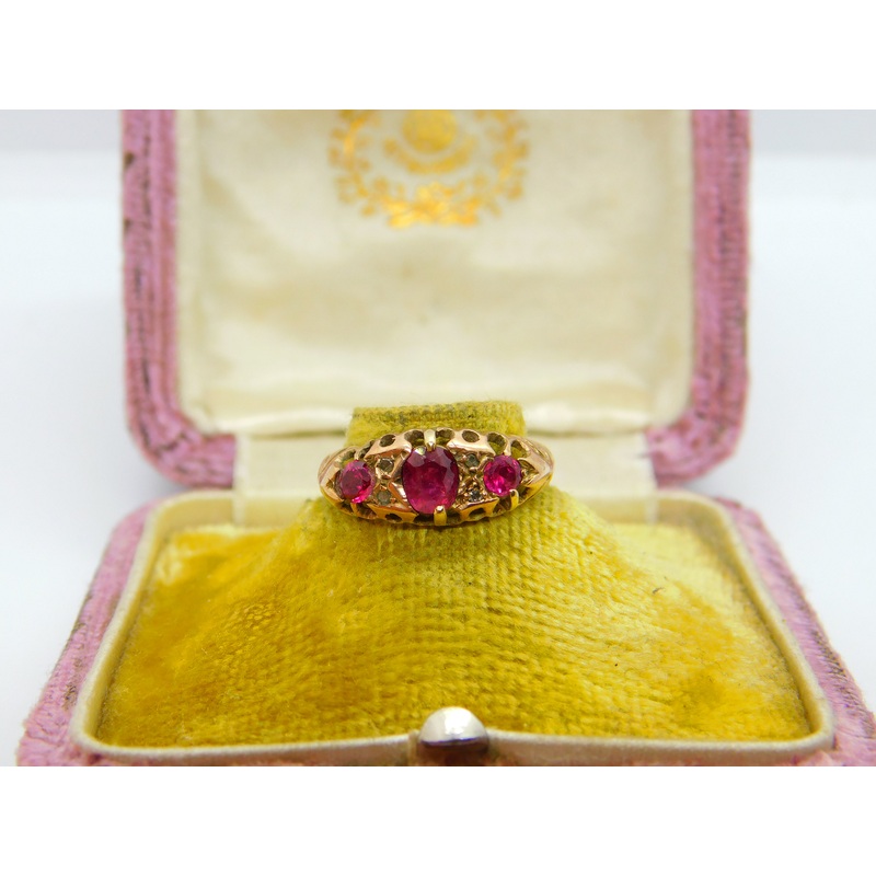 Details: A fantastic and wonderfully designed antique Victorian 9ct yellow gold boat ring set with natural ruby and diamond stones hallmarked Birmingham, 1890. The stones have been tested. This is a wonderful item that would make a perfect gift or addition