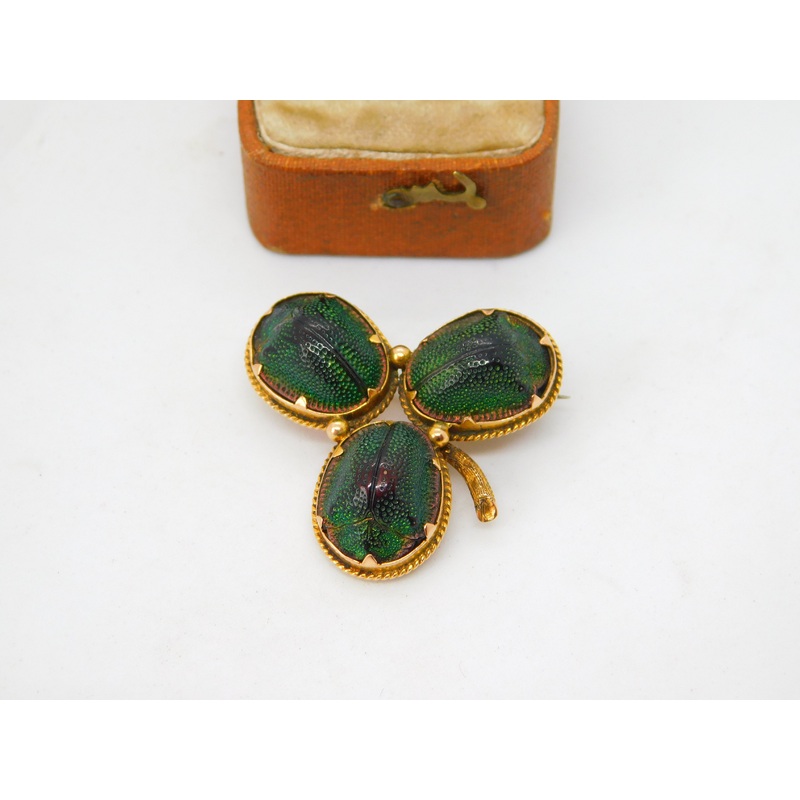 Details: A fantastic and wonderfully designed antique Victorian egyptian revival lucky shamrock brooch set in 9ct gold with three authentic scarab beetles hallmarked to the reverse c1880. This is a wonderful item that would make a perfect gift or addition