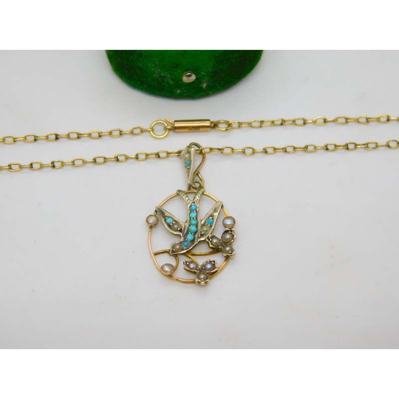 Be the first to review “Victorian 9ct Gold, Seed Pearl & Turquoise Swallow Pendant Necklace Antique 1890”